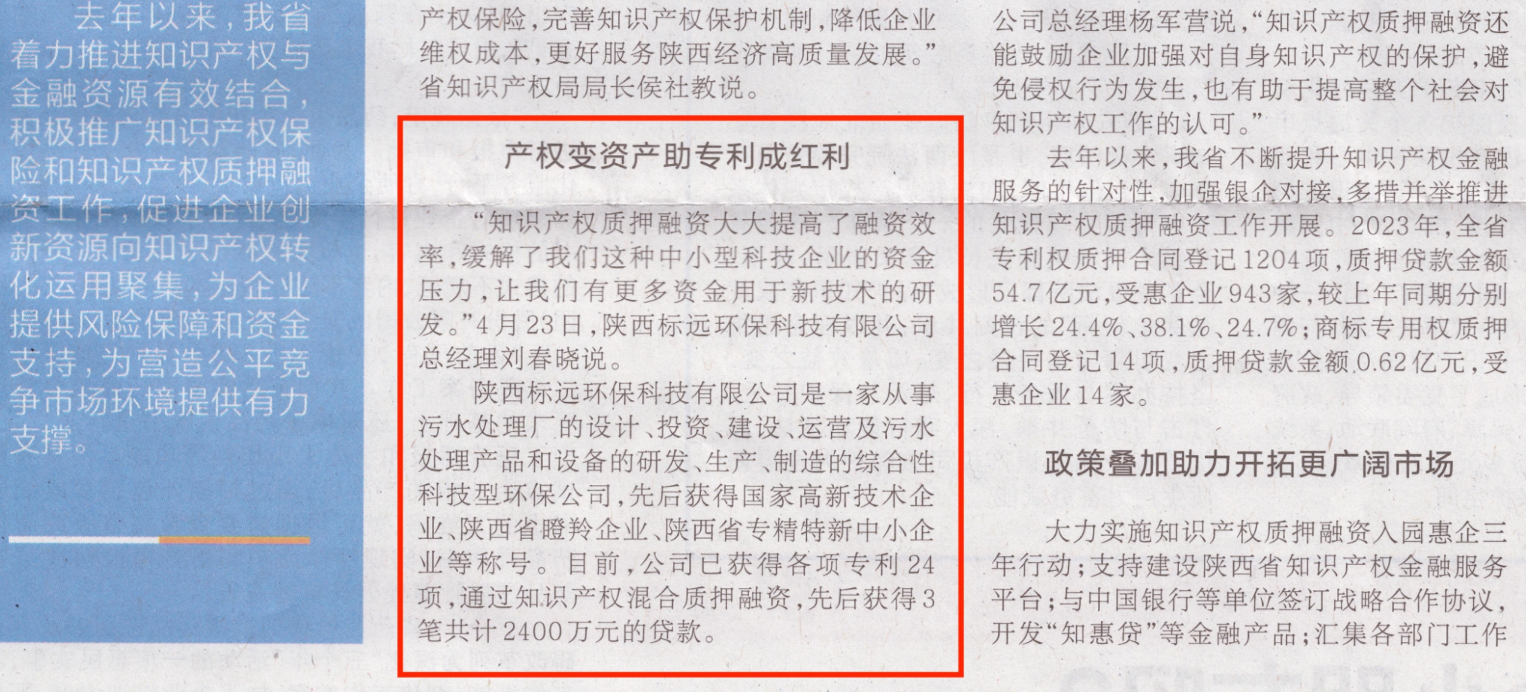 “知識產(chǎn)權質押融資大大提高了融資效率,緩解了我們這種中小型科技企業(yè)的資金壓力,讓我們有更多資金用于新技術的研發(fā)。4月23日,陜西標遠環(huán)保科技有限公司總經(jīng)理劉春曉說。